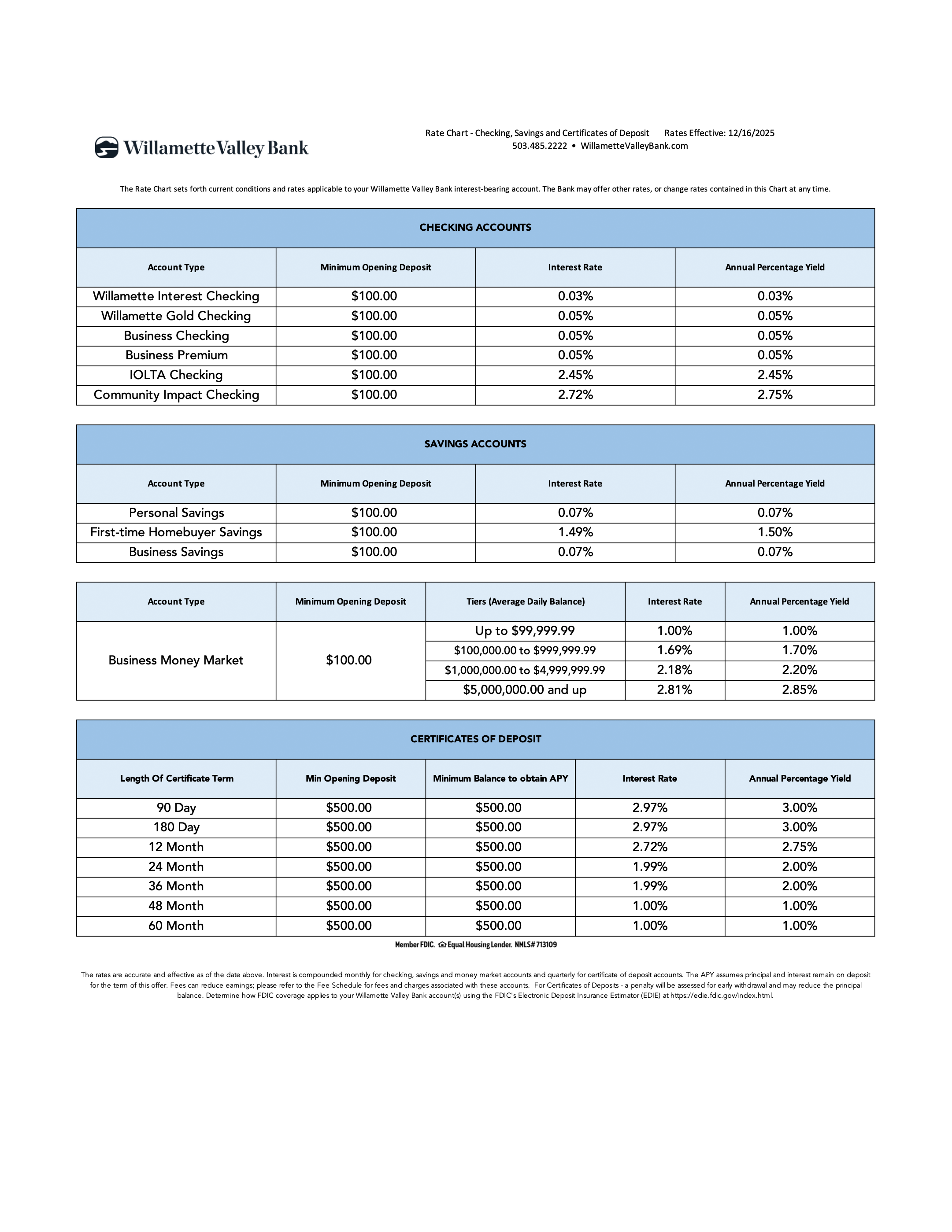 Checking, Savings, and Certificates of Deposit rates effective 12/16/2025.
